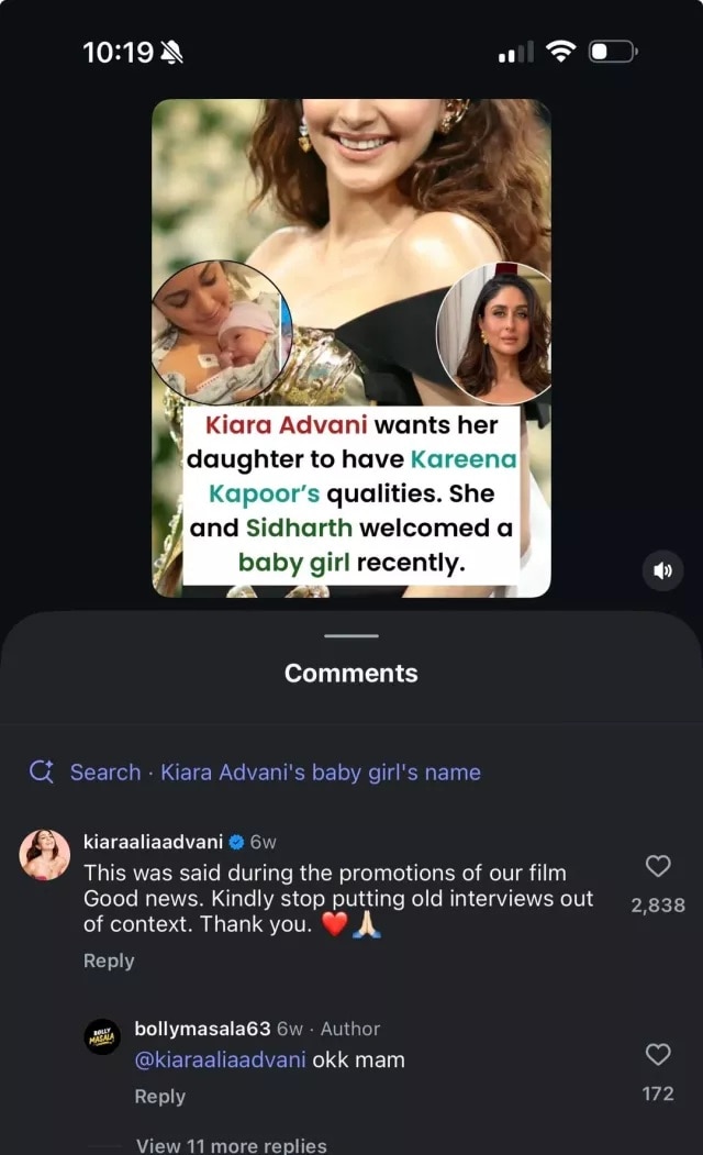 15 जुलै 2025 रोजी कियारा आणि सिद्धार्थ आई-बाबा झाले. दोघांनाही एक गोंडस मुलगी झाली. अर्थात या चिमुकलीचा चेहरा अजून जगासमोर आलेला नाही. मात्र कियारा आई झाल्यानंतर एका मनोरंजक विषय पेजने कियारा आणि करिनाचा एकत्र फोटो शेअर करत तिचं एक जुनं विधान त्यावर टाकलं. “माझ्या मुलीमध्ये करिना कपूरचे गुण असावेत,” अशी इच्छा कियाराने व्यक्त केली होती अशी आठवण या पोस्टमधून करुन देण्यात आलेली. मात्र काही आठवड्यांपूर्वी शेअर केलेली ही पोस्ट कियारापर्यंत पोहोचली तेव्हा ती पोस्ट पाहून चांगलीच खवळल्याचं दिसत आहे. हे विधान आपण एका जुन्या मुलाखतीत केल्याचं स्पष्टीकरण कियाराने दिलं आहे.