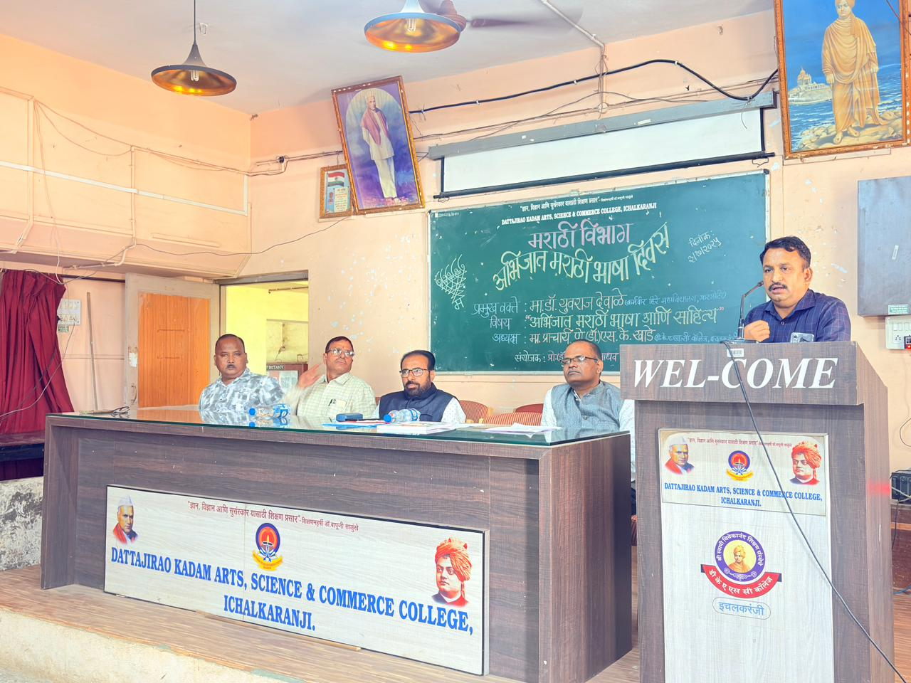 इचलकरंजी: दत्ताजीराव कदम आर्ट्स, सायन्स अँड कॉमर्स कॉलेज(college) इचलकरंजी येथे महाविद्यालयातील मराठी विभागाच्या वतीने अभिजात मराठी भाषा दिवस या निमित्ताने विशेष व्याख्यानाचे आयोजन केले होते. सदर समारंभ प्रमुख पाहुणे डॉ. युवराज देवाळे यांच्या उपस्थितीत व मा. प्राचार्य प्रो. (डॉ.) एस. के. खाडे यांच्या अध्यक्षतेखाली संपन्न झाला.आपल्या मनोगतामध्ये बोलताना प्रमुख पाहुणे डॉ. युवराज देवाळे म्हणाले, “अभिजात भाषेचा दर्जा मराठी भाषेला मिळाला. ही आपल्या सर्वांसाठी अभिमानाची आणि आनंदाची गोष्ट आहे.