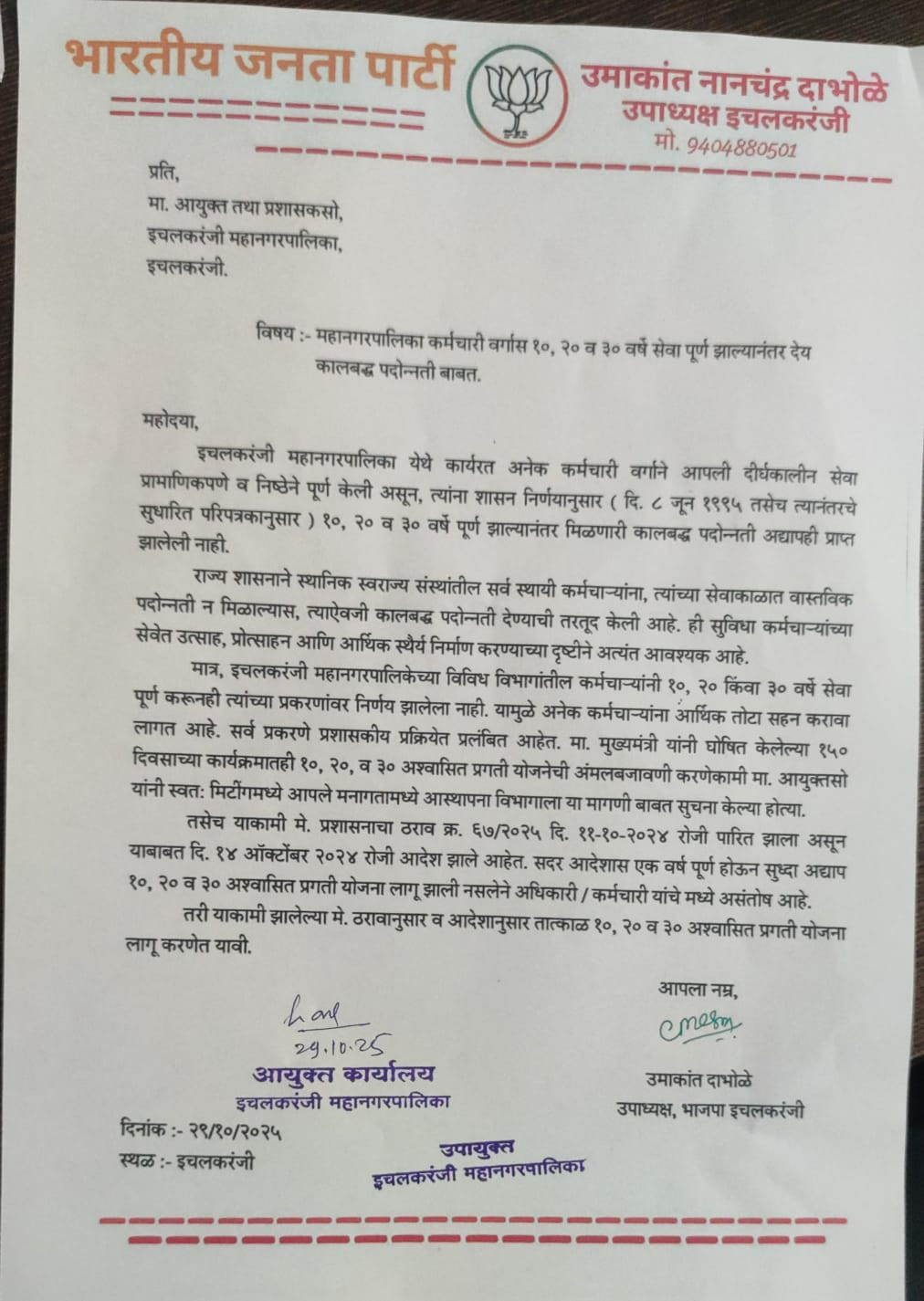 दाभोळे यांनी दिलेल्या निवेदनात म्हटले आहे की, राज्य शासनाने स्थानिक स्वराज्य संस्थांतील सर्व स्थायी कर्मचाऱ्यांना त्यांच्या सेवाकाळानुसार कालबद्ध पदोन्नती देण्याचे नियम निश्चित केले आहेत. मात्र, इचलकरंजी महानगरपालिकेतील विविध विभागातील कर्मचाऱ्यांना १०, २० किंवा ३० वर्षे सेवा पूर्ण होऊनसुद्धा ती पदोन्नती आजपर्यंत देण्यात आलेली नाही. त्यामुळे अनेक कर्मचाऱ्यांना अन्याय सहन करावा लागत आहे.