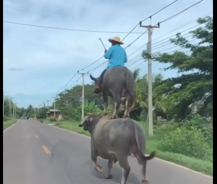 सोशल मीडियावर व्हायरल होत असलेल्या या व्हिडिओमध्ये आपण पाहू शकता, यात मोकळ्या रस्त्यावर एक माणूस आपल्या सफरचा आनंद घेताना दिसून आला. परंतु त्याची ही सफर तो कोणत्या गाडीवर बसून नाही तर दोन म्हशींवर बसून करताना दिसून आला. व्हिडिओमध्ये एक मोठी म्हैस, त्यावर आणखीन एक म्हैस (Social media)आणि त्यावर बसलेला माणूस हे अजब गजब कॉम्बिनेशन पाहायला मिळाले. मुख्य म्हणजे कुणाचाही तोल यावेळी ढासळत नव्हता आणि मजा लुटतच सर्व या प्रवासाचा आनंद लुटत होते. ही दृश्ये काही सामान्य नसून हे नक्की सत्य आहे की एआय असा प्रश्न आता युजर्स करत आहेत. ही दृश्ये एका कारमधून मोबाईलच्या कॅमेरात कैद करण्यात आल्याचे समजून येत आहे. व्हिडिओतील दृश्ये खरोखर अजब असून याच्या सत्यतेबाबत कोणतीही ठोस माहिती मिळालेली नाही.