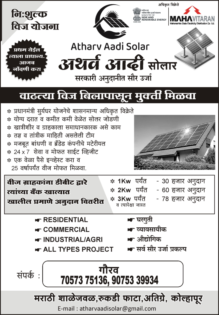 राज्य सरकारने आर्थिकदृष्ट्या दुर्बळ घटकांसाठी ‘महाराष्ट्र आवासीय रूफ टॉप (स्मार्ट)’ योजना आणली आहे. मुख्यमंत्री देवेंद्र फडणवीस यांनी वीजबिलाचा(electricity) ताण कमी करण्याचे आश्वासन दिले होते. या योजनेतून ५ लाख कुटुंबांना मोफत वीज मिळणार असून, यासाठी ६५५ कोटी रुपयांची तरतूद करण्यात आली आहे.