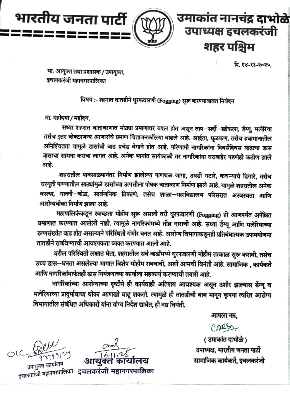 इचलकरंजी : शहरातील वातावरणातील अचानक बदल, आर्द्रता, धुक्याचे प्रमाण आणि हवामानातील अनिश्चिततेमुळे डेंग्यू, मलेरिया तसेच इतर व्हेक्टरजन्य आजारांचे प्रमाण वाढू लागले आहे. परिणामी डासांचा (Mosquito)प्रादुर्भाव मोठ्या प्रमाणात वाढत असून नागरिकांना अस्वस्थतेचा गंभीर सामना करावा लागत आहे. या पार्श्वभूमीवर भारतीय जनता पार्टीचे इचलकरंजी शहर पश्चिमचे उपाध्यक्ष उमाकांत नानाचंद्र दाभोळे यांनी महानगरपालिका आयुक्त तथा प्रशासक पल्लवी पाटील आणि उपायुक्त अशोक कुंभार यांच्याकडे लिखित निवेदन देत तातडीने धूरफवारणी (Fogging) सुरू करण्याची मागणी केली आहे.