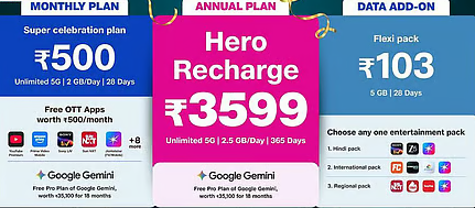 विशेष म्हणजे या प्लॅनमध्ये YouTube प्रीमियम, जिओहॉटस्टार, (Recharge)अमेझॉन प्राइम व्हिडिओ, सोनी लिव्ह, झी५ यांसारख्या ओटीटी प्लाटफॉर्मचा समावेश असणार आहे. या प्लानसोबत तुम्हाला १८ महिन्यांचा मोफत गुगल जेमिनी प्रो प्लॅन देण्यात येणार आहे. जिओटीव्ही आणि जिओएआय क्लाउडचे जास्त फायदेही मिळतात.वर्षभराचा रिचार्ज प्लान करत असाल तर जिओने हिरो अॅन्युअल रिचार्ज हा वार्षिक प्लान दिला आहे.